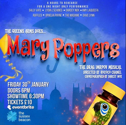 Riotous drag improv Mary Poppins remix, bursting with camp, wit and heart, written and directed by Rococo Chanel, choreographed by Darcey Nox. Raising money for The Sussex BeaconThis is a fundraising event.